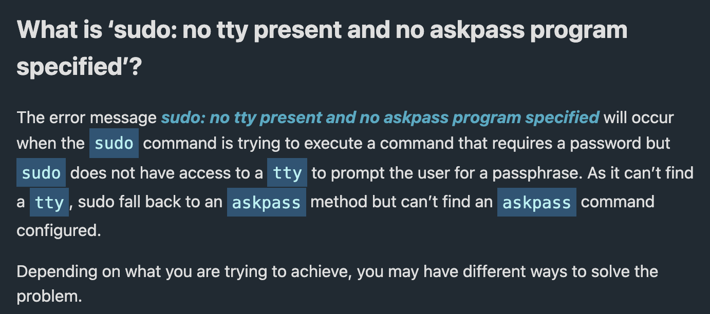 sudo 명령이 암호가 필요한 명령을 실행하려고 하지만 sudo가 사용자에게 암호를 입력하라는 메시지를 표시할 수 있는 tty에 액세스할 수 없는 경우다. 젠킨스가 스크립트를 실행하면서 암호가 필요한데, tty를 찾을 수 없기 때문에 sudo는 다시 askpass 메서드로 폴백하지만 구성된 askpass 명령을 찾을 수 없는 것. 그렇다면 암호가 필요없다고 명시적으로 선언을 해줘야한다.