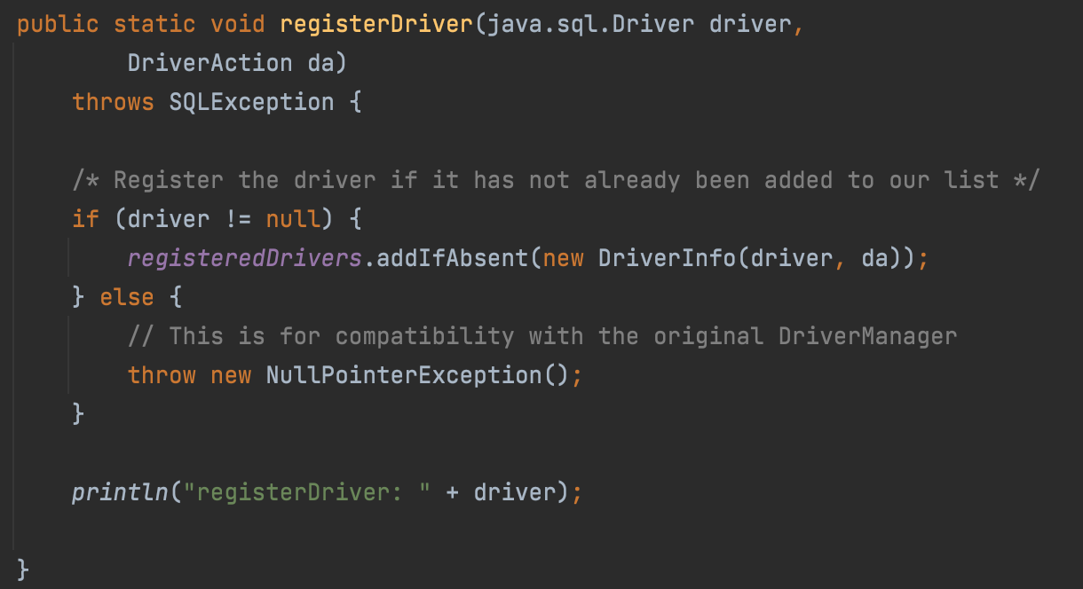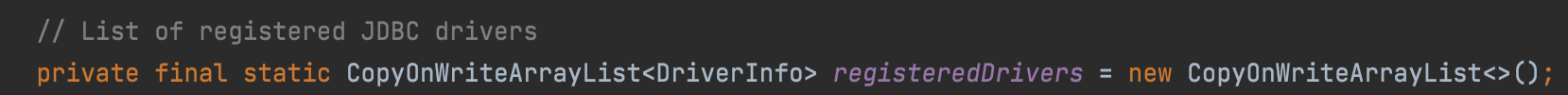 registerDriver()의 과정을 좀 더 살펴보면 static 필드인 registerDrivers에 현재 드라이버를 저장하는 것을 볼 수 있다.