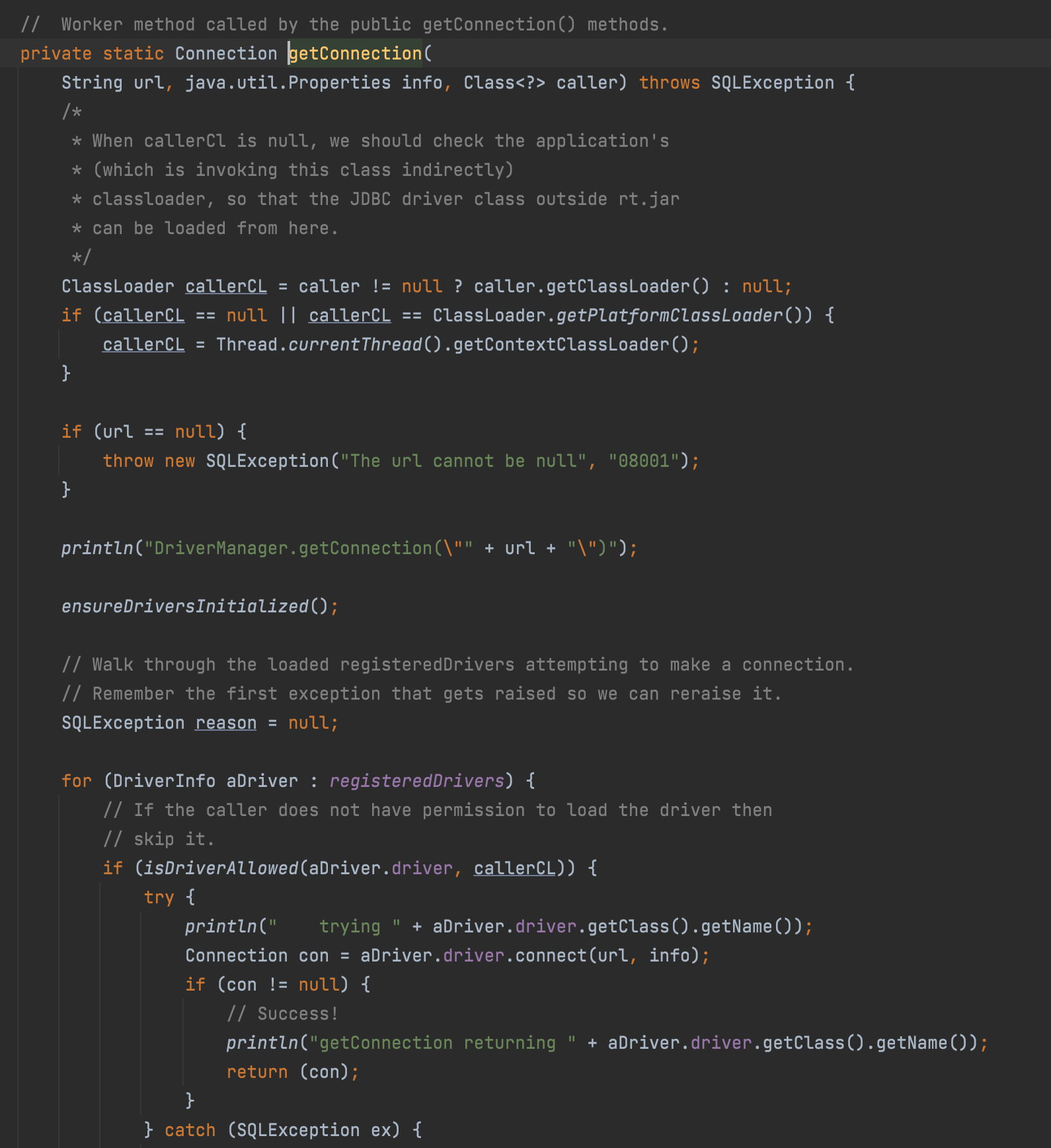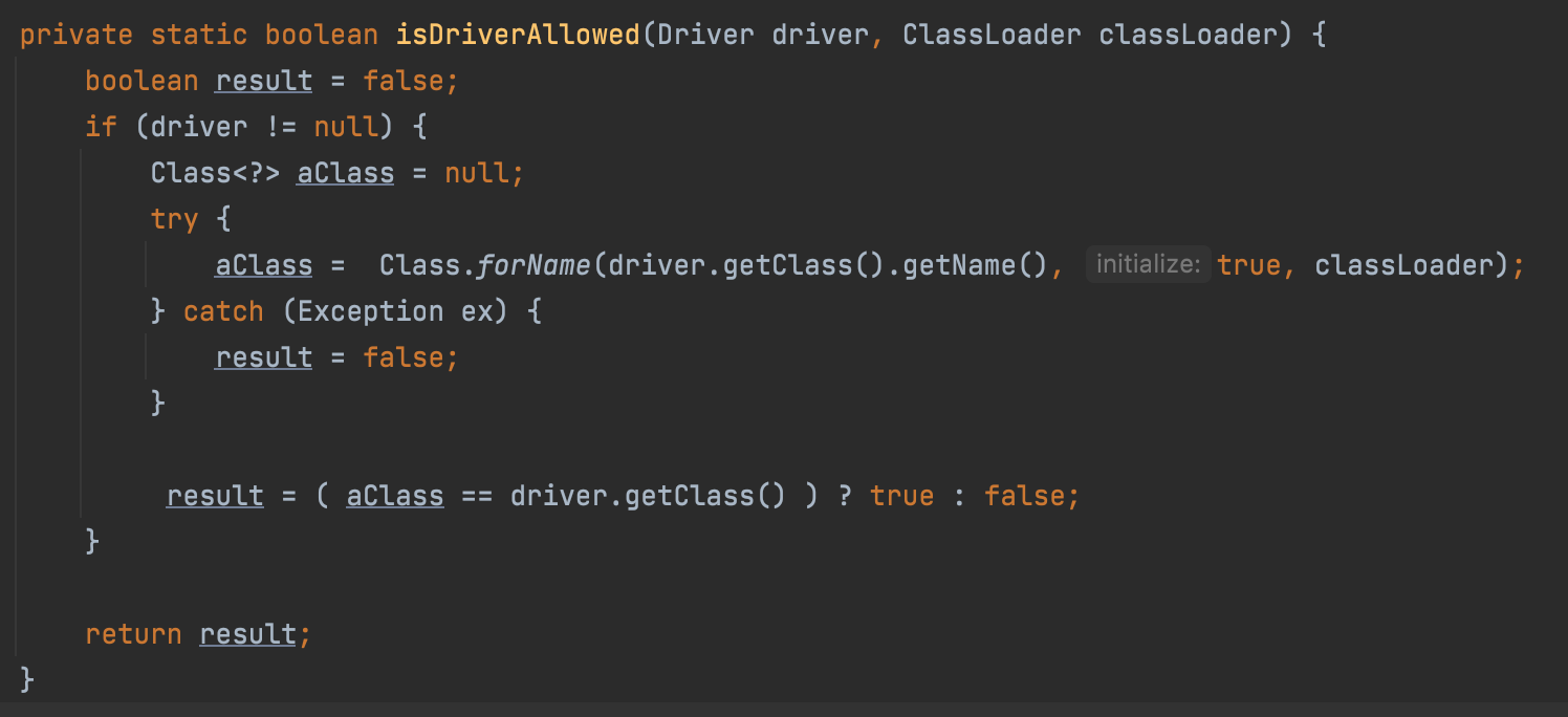 isDriverAllowed에서는 아까 메서드를 호출한 클래스에서 이 드라이버 클래스가 존재하는지 확인하고, 존재한다면 jdbc가 static으로 가지고있던 driver와 일치하면 true를 반환해주는것이다.