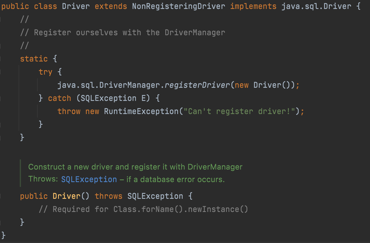 거치지않고 사용할 수 있는데, 그게 가능한 이유가 아래 코드처럼 정적 블록이 있어서 클래스를 로드할 때 registerDriver() 과정을