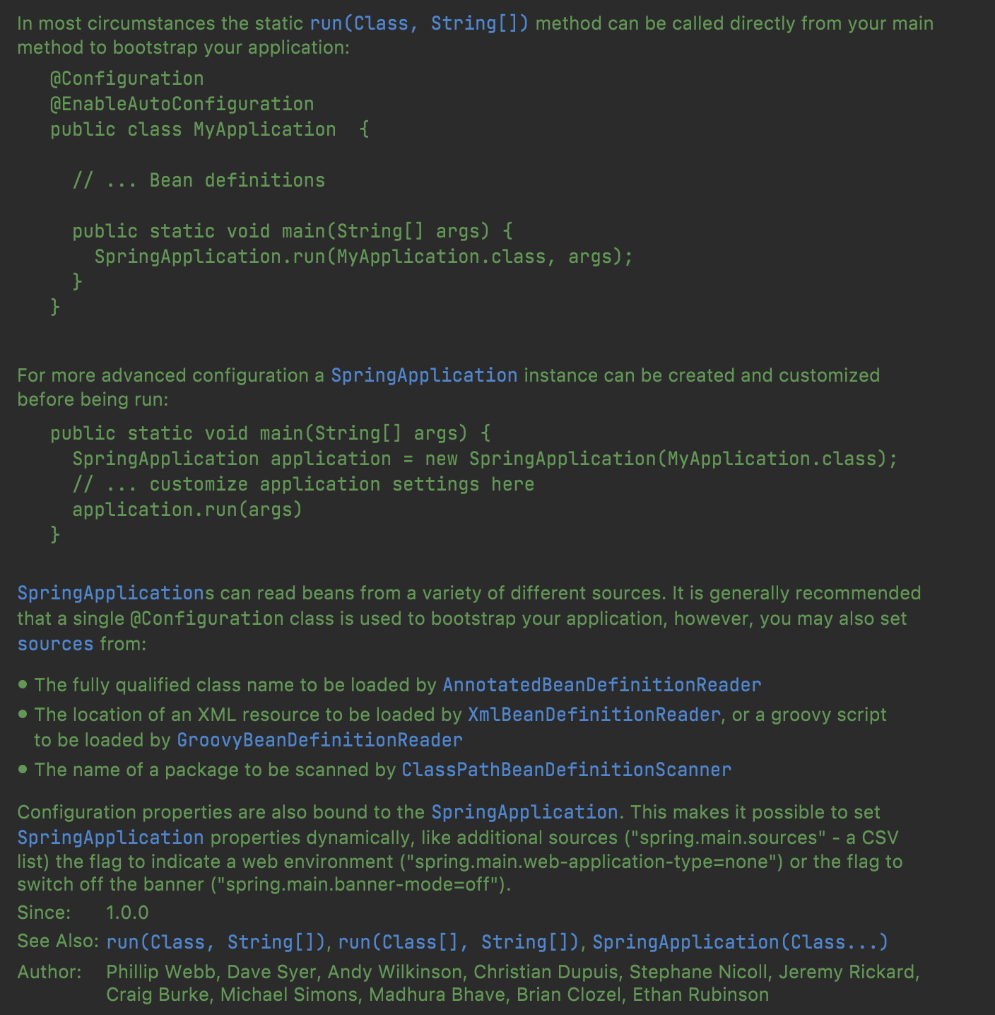 생성자는 자바독 상단에 모아서보여주지만, 정적 팩터리 메서드는 api 문서에서 특별하게 다뤄지지않는다. 따라서 클래나 인터페이스 문서상단에 팩토리 메소드에 대한 문서를 제공하는게 좋다. 아래와 같이, SpringApplication.run은 static 메서드고 최상단에 관련된 설명이 나와있다.