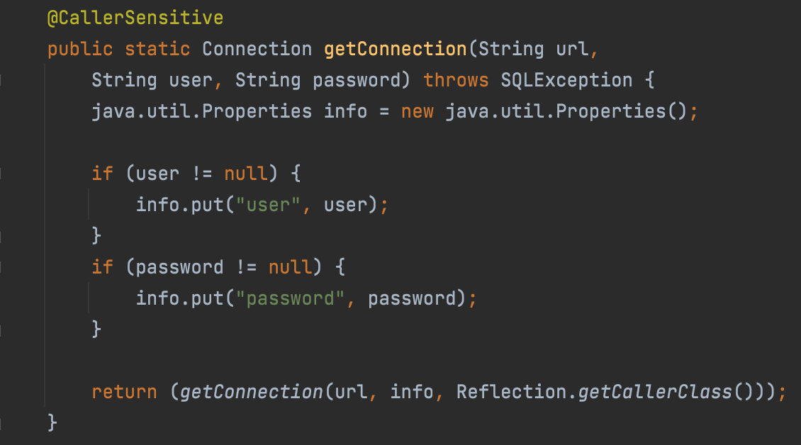 다음으로 getConnection 과정을 살펴보면, user와 password를 Properties에 담고 private static getConnection을 호출한다.