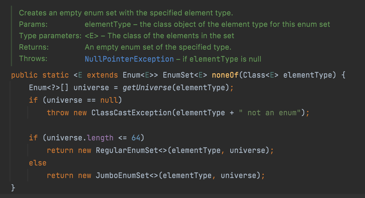 Jumbo와 Regular는 클라이언트 입장에서 알 필요도 없고, 미래에 내부 구현체가 바뀔 때 유연성을 가진다. EnumSet의 하위 클래스기만 하면 되니까.