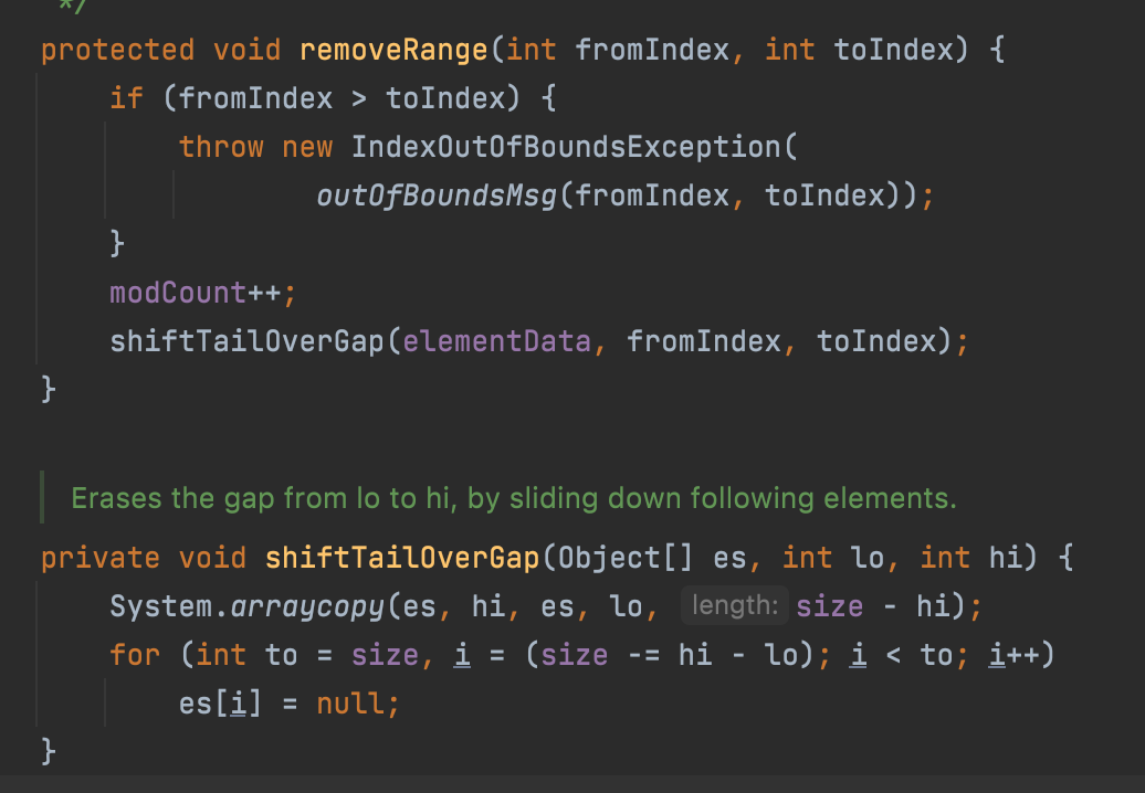 lo는 fromIndx고 hi는 toIndex이니, fromIdx 이후의 값을 toIdx 이후의 값으로 옮기고, 이후 뒤에 있는 지워야 할 값들을