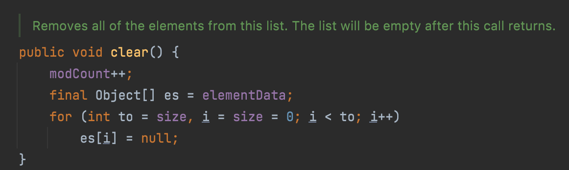 아래 AbstractList.clear 메소드를 보자. clear()는 정확하게 최악의 시간복잡도 O(N^2)이 된다.
