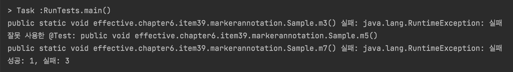 InvocationTargetException 외의 예외는 @Test를 잘못 사용한 것으로, 인스턴스 메소드거나 매개변수가 있거나, 호출할 수 없는 메소드 등에 달았다는 것이다. 위에서 설명한대로 매개변수없는 정적 메소드만 가능한 애노테이션이기 때문에 그러한 예외가 발생하는 것이다.