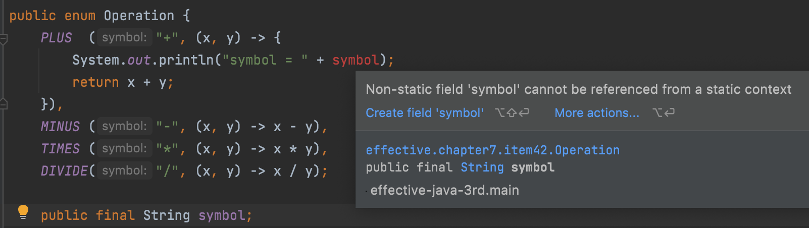 따라서 열거 타입 생성자 안의 람다는 인스턴스가 런타임에 만들어지기 때문에 열거 타입의 인스턴스 멤버에 접근할 수 없다.