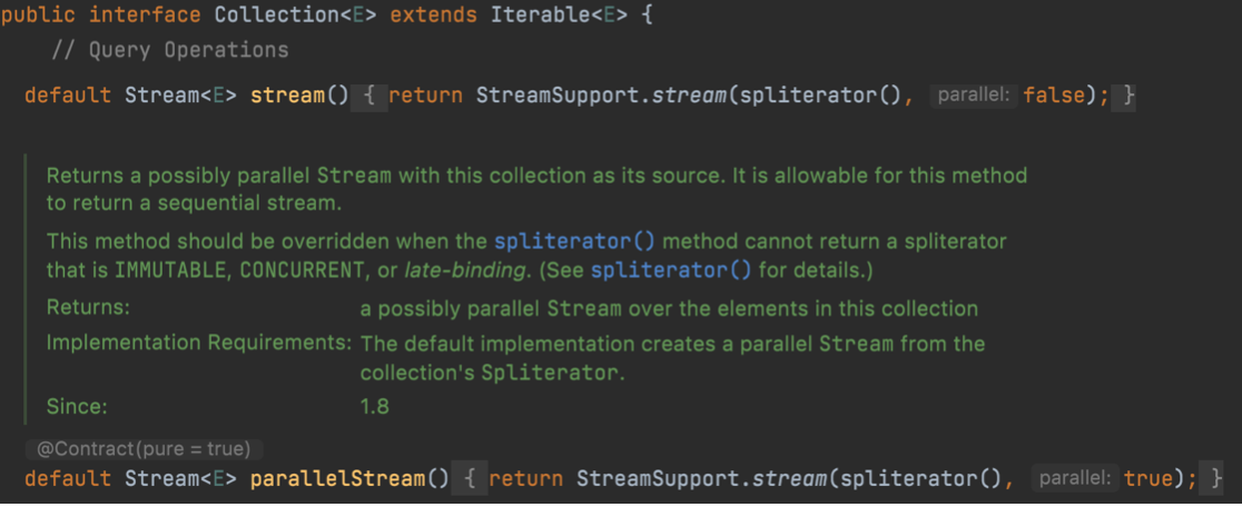 *Iterable의 디폴트 메소드인 spliterator는 BaseStream 인터페이스의 추상메소드로, forEach는 Stream 인터페이스의 추상메소드로 존재한다.