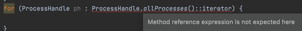 for (ProcessHandle ph : (Iterable<ProcessHandle>) ProcessHandle.allProcesses()::iterator) {