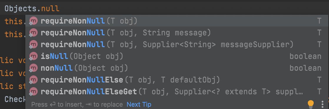 추가로 null과 관련된 어떤 정적 메소드들이 있는지 궁금해서 Objects.null을 타이핑해서 자동완성되는 것을 확인했다.