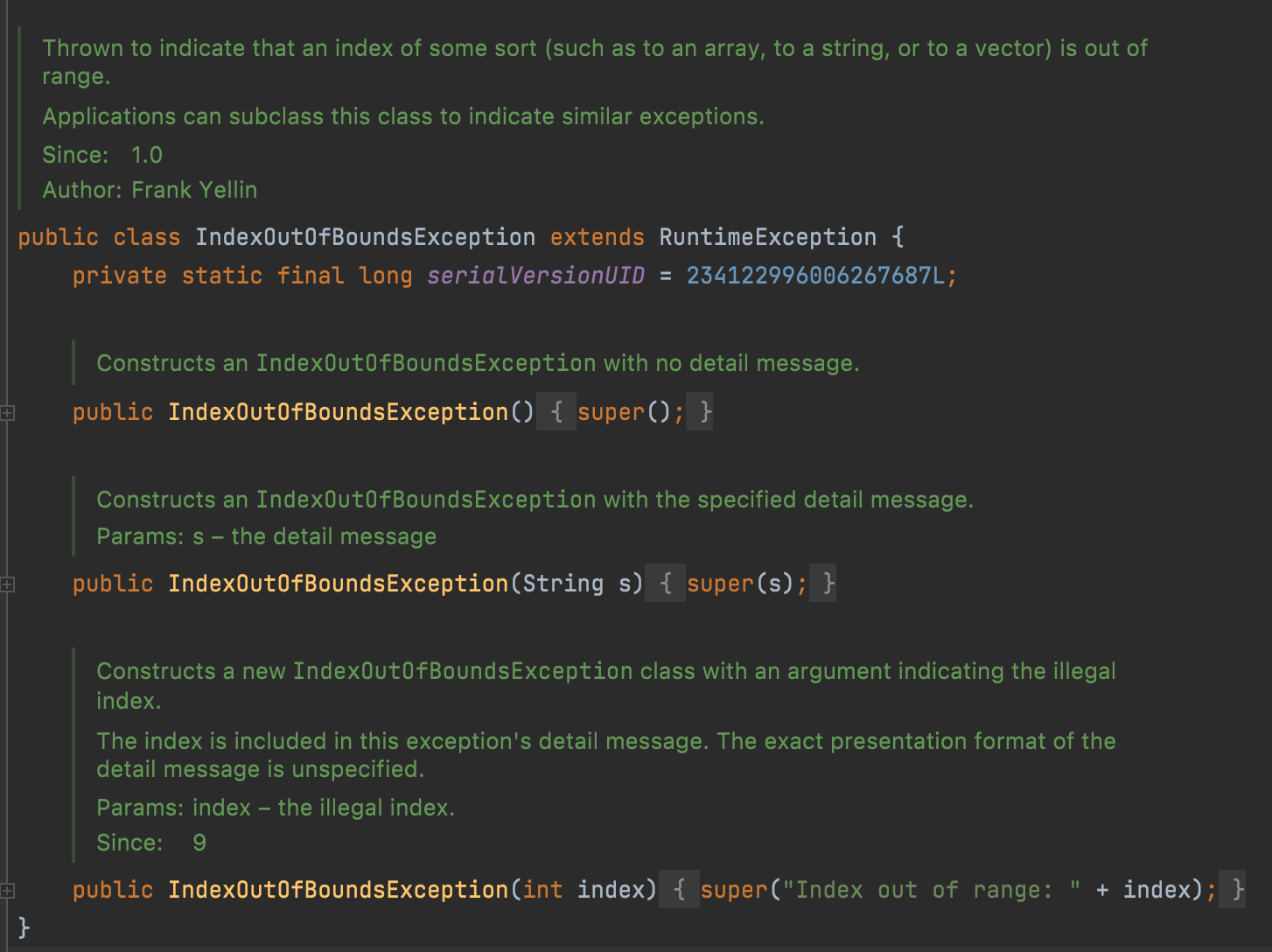 public class IndexOutOfBoundsException extends RuntimeException {
