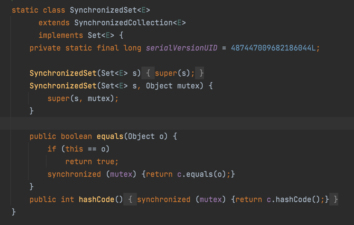 keySet이 존재하지 않는다면 SynchronizedSet 구현체를 넣는 것을 알 수 있다. 이 때, 락 객체는 SynchronizedMap과 같은 mutex를 공유한다. 그리고 SynchronizedMap을 생성할 때 매개변수로 넣었던 Map의 keyset을 가져온다. SynchronizedSet 클래스를 보자.