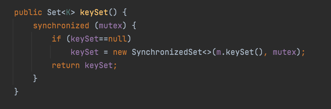 이 맵의 keyset은 synchronized block에서 사용할 필요가 업고 keyset을 꺼낸 Map을 동기화 하라고 나온다. keyset의 iterator를 돌릴건데 왜 Map을 동기화 하란걸까? 우선 synchronizedMap의 keyset 메소드를 한 번 보자.