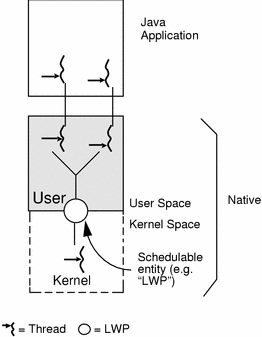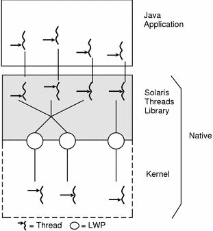 3 이후부터는 Native Thread 방식으로 바뀌게 되었는데 여러 개의 커널 스레드와 여러 개의 유저 스레드를 매핑하는, 즉 ManyToMany 방식으로 바뀌었다는 뜻이다. 이렇게 되었으니 스레드 스케줄링은 OS가 가지고 가게 되고, 내부적으로 유저 스레드를 통해서 각 스레드들을 관리하는 것이다.